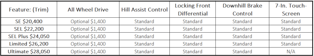 The Kona has a lot of the same features as the Seltos, but some features that not even available on the Kona. A locking front differential, hill start assist, and downhill brake control are all standard but all wheel drive is a $1,400 option. On the Kona there is a 7 inch display on all trims except the Ultimate which has the largest with a 8 inch display. Available only on the Ultimate are parking sensors which is a feature that the Seltos does not offer. The interior of the Kona did not feel quite as spacious as the Seltos nor did it have leather or climate control, but it did have Sirius XM and a stylish hounds-tooth seat inserts. There appeared to be slightly less room in the back seats but the space up front is similar. The arm rest on the door panel caused my arm to feel unsupported and would even slip and fall occasionally, this is something that only taller drivers will experience because sitting further forward solved the problem.